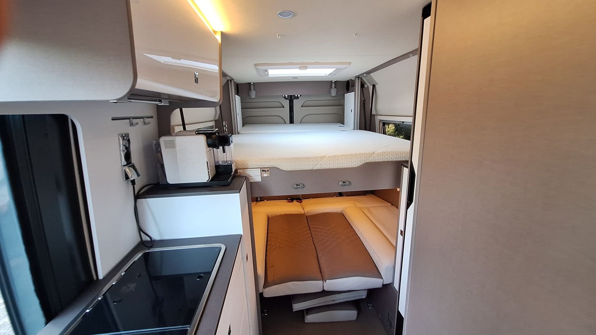 Unser Luchs bietet mit einem Hub-Längsbett (205x156) und einer Rundsitzgruppe umgebaut zum Bett (183×147) Platz für 4 Personen. Mit seiner tollen Hecksitzgruppe und einzigartigem Lichtkonzept sind Abende auch im Wohnmobil gemütlich. Außerdem ist er mit einem komfortablen Vario Schwenkbad ausgestattet. Selbstverständlich ist unser Luchs mit Campinggeschirr, Campingmöbeln, einer Nespresso Kapselmaschine und allem was für eine Campertour benötigt wird, bestens ausgestattet. Haustiere sind nur in unserem Wolf erlaubt. Rauchen ist in unserem Fahrzeug grundsätzlich verboten. Bei Zuwiderhandlung werden mindestens 200€ der Kaution einbehalten. Der Innenraum ist vom Mieter besenrein zu übergeben. Für die Reinigung der Chemietoilette, sowie dem Schmutzwassertank berechnen wir 100€, wenn vom Mieter nicht gereinigt. Optional könnt Ihr auch ein oder zwei E-Mountainbikes dazu buchen. Der Fahrer unseres Wohnmobils muss mindestens 21 Jahre alt sein und im Besitz eines gültigen Führerscheines der Klasse B sein. |