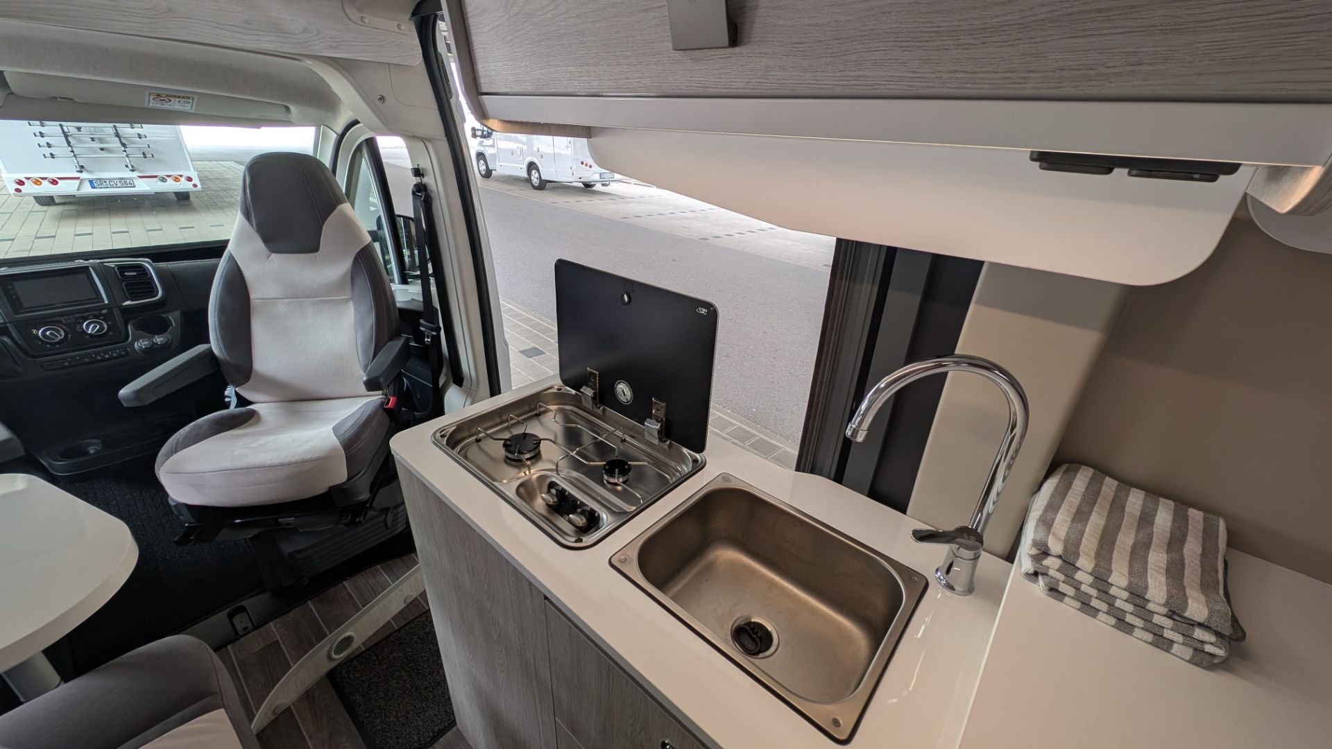 Unser neuwertiger "Roller Team Livingstone Duo XL" Kastenwagen bietet trotz seiner kompakten Abmaße ein großzügiges Platzangebot und umfangreiche Ausstattungsmerkmale. Neben Raffinessen wie Standheizung, Anhängekupplung und dem 9-Gang Automatik-Getriebe erlaubt das große Längsbett im Heck elektrisch nach oben gefahren zu werden, um so einen riesigen Heckstauraum zu ermöglichen. Technische Daten: - FIAT 2,3 L- 140 PS Euro 6d - 9-Gang-Automatikgetriebe - 16" Bereifung Alufelgen - Style-Paket mit Außenfarbe Lanzarote Grey - zul. Gesamtgewicht: 3500 kg/ Führerschein B/ oder 3er - Leergewicht: 2930 kg - max. Anhängelast 2500 kg - Airbag Fahrer/ Beifahrer - ABS + ESC - Rückfahrkamera - zugelassene Sitzplätze 4 - Traction + und Berganfahr-/ und Abfahrhilfe - Tempomat inkl. Speedlimiter - Zentralverriegelung mit Funkfernbedienung - Front- und Seitenscheibenplisse - Wärmeschutzverglasung Wohnbereich: - Eingang mit elektrischer Eintrittstufe - Fliegenschutztür - Verlängerung Dinette/ Tisch - drehbare und höhenverstellbare Fahrerhaussitze mit Armlehnen - Panoramadachhaube 700x500 oberhalb der Sitzgruppe - Küchenzeile inkl. 2- Flamm-Kocher, Spüle, 3x Schubladen und Oberschrank - Kühlschrank 80 Liter (hoch angebracht) 12V/230V/Gas - separate Nasszelle mit Dusche, Waschbecken und drehbarer Cassettentoilette und seitlichem Milchglasfenster - Doppelbett m. Lattenrost im Heck 1,85m x 1,58m - elektrisch höhenverstellbar - Sitzgruppe umbaubar zum Notbett / 1,70m x 50cm - ISOFIX - Frischwasser/ Abwasser 100/90 Liter - TRUMA Combi-Heizung und Warmwasser 4000 Watt (Gas) - EXPS EVO exklusive Innenisolierung gegen Temperatur- und Geräuscheinwirkungen sowie zur Vermeidung von Wärmebrücken Ausstattung: - große Aufbaubatterie 120 AH - Solarpanel mit automatischem Regler - Markise - Fahrradträger (2 Fahrräder) - Platz für 2 Gasflaschen - Anschluss für Außendusche - Dachluken - komplette LED Beleuchtung - USB, 12 V und 230 V Ladedosen im Fahrzeug vorhanden - hochwertige Druckwasserpumpe verbaut - Oberschränke - Fenster inkl. Fliegenschutz und Verdunklungsrollo - neutrales Design vom Hersteller, keine Werbeaufkleber Servicepauschale / Übergabe / Basiszubehör (einmalig €119,00) - Einweisung des Fahrzeugs bei Übergabe - 2 x Garten/Campingstühle mit stabilen Campingtisch (mehr Stühle als Zusatzausstattung verfügbar) - 2 x 11kg Gasflaschen (eine voll und eine teilgefüllt) - Umfangreiches Campinggeschirr-Set (Melanin) für 4 Personen (Teller, Tassen, Schüsseln, Besteck, Kochtopf, Pfanne, Gläser, Gewürze, Schneidebrett, div. Messer) - Wasserkocher 220V - jeweils frisch gereinigte Spannbettlaken aus hochwertigen Jersey - 3-er Steckdosenverteiler - CEE 230V Camping Kabel Set (für Anschluß am Campingplatz) und 10m Verlängerungskabel - Werkzeugset Basic (Hammer, Zangen, Schraubendreher, Klebeband, Kabelbinder usw.) - Auffahrkeil-Set (3-Stufen) mit Wasserwaage - Verstärkte Markisenheringe aus verzinktem Stahl - Gießkanne - Verbandskasten - Signalwesten - Stabile Alukiste |
